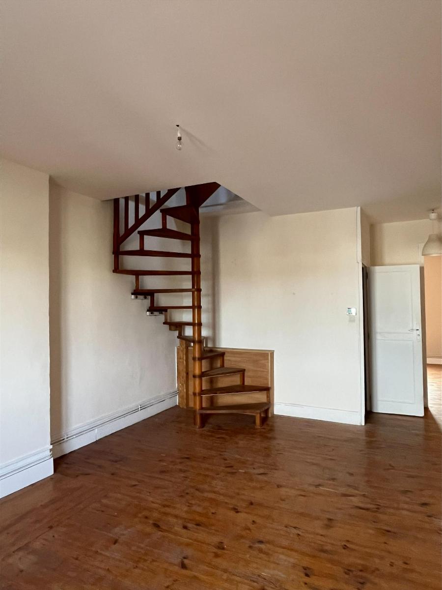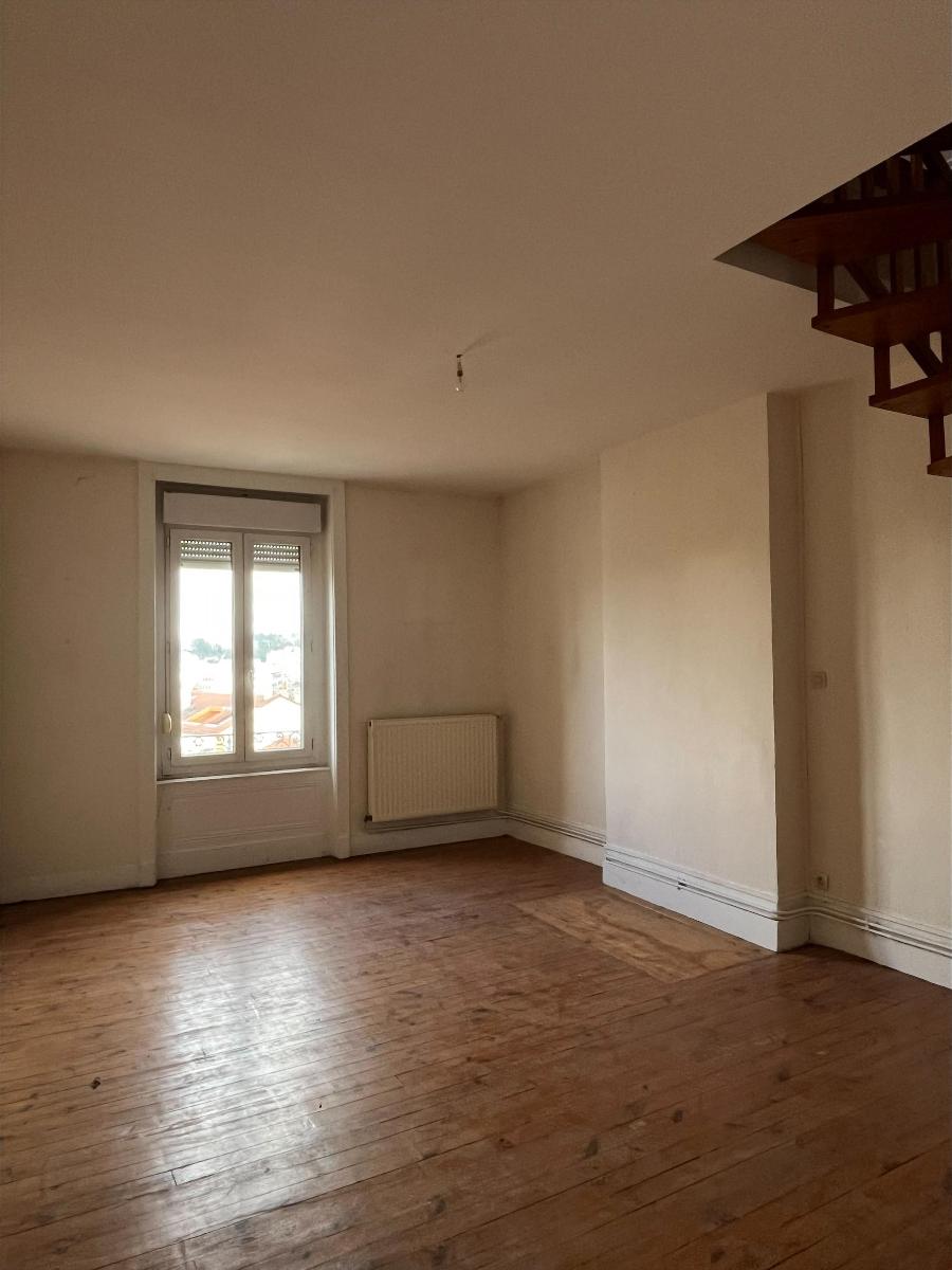 T3 en duplex secteur Bellevue - Rue le CHATELIER - appartement offrant un hall d'entrée , une cuisine indépendante un séjour - wc salle de bains avec baignoire et à l'étage un dégagement 2 chambres- et 2eme toilette - chauffage central individuel au gaz - libre rapidement - loyer mensuel 480 Euros + charges - frais d'agence 305 Euros TTC -Cabinet Georges SABOT 04.77.38.20.20.